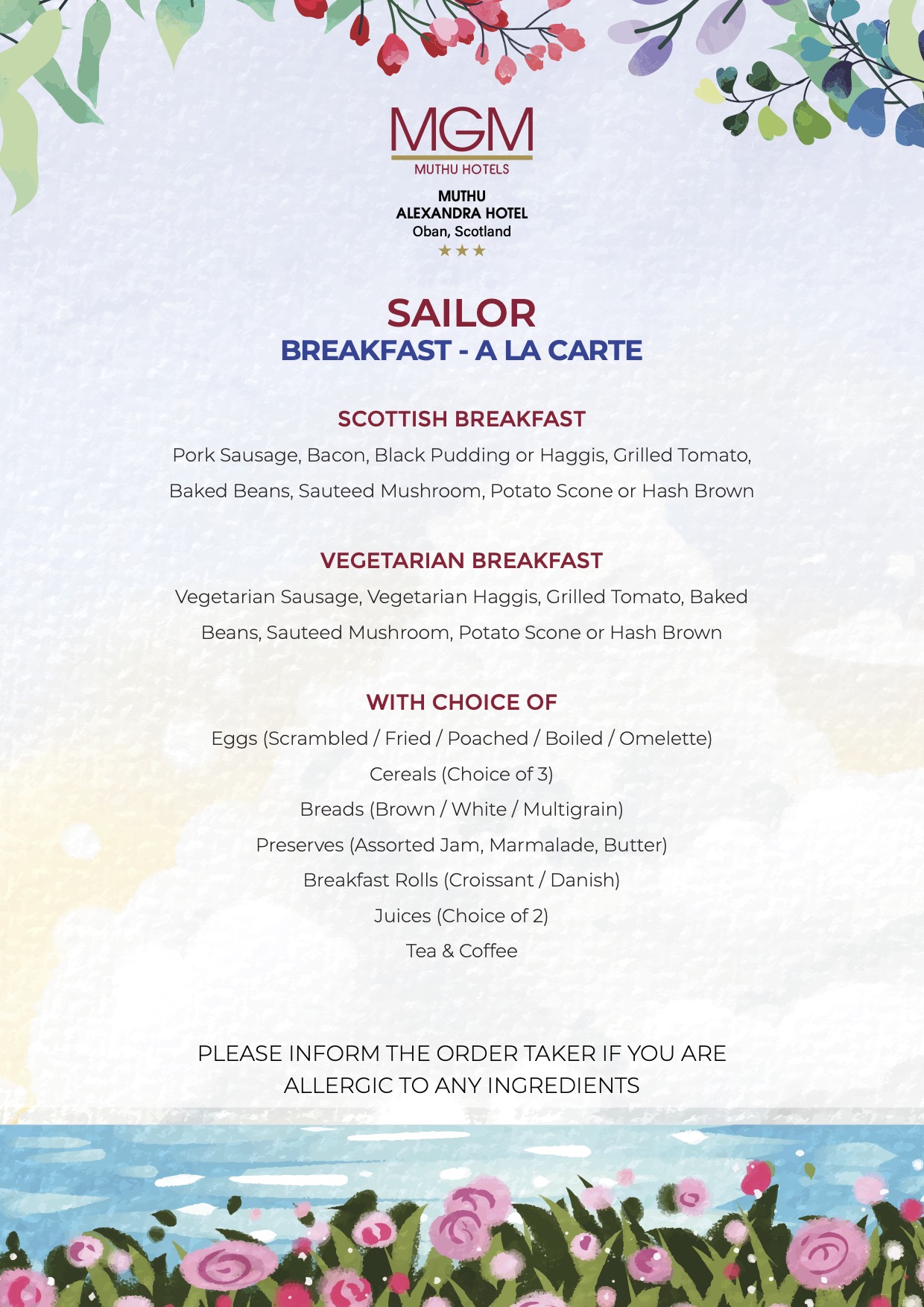 Le Muthu Alexandra Hotel, à Oban, accueille les clients de l'hôtel et les convives locaux dans un coin confortable pour un repas intime à deux ou un régal en famille. Nous croyons beaucoup aux ingrédients d'origine locale et aux produits de saison pour nos menus, ce qui signifie qu'occasionnellement les plats de nos menus annoncés peuvent varier.